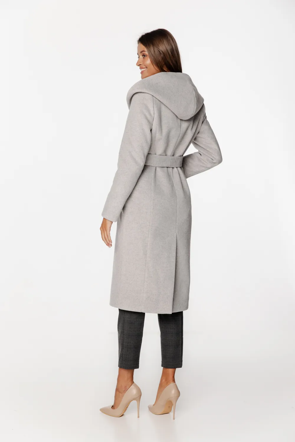 Płaszcz jest ocieplany, podszyty miękką podszewką z wiskozą i zapinany na guziki. Długość za kolano i rozcięcie z tyłu zapewniają wygodę podczas codziennego użytkowania. Pasek w talii pozwala subtelnie dopasować sylwetkę, a praktyczny kaptur chroni przed zimnem i wiatrem, zachowując estetykę prostego, eleganckiego kroju. Model został zaprojektowany i uszyty w Polsce, z dbałością o każdy detal.